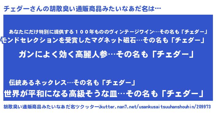 | 意味不明あだ名 | 『自称チェダー』『もやし科チェダー属』 |