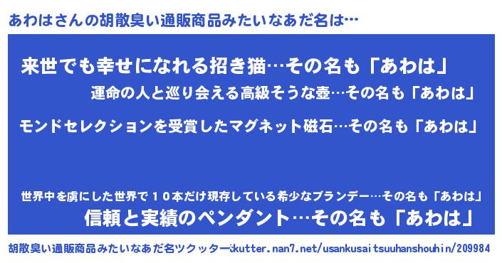 | ヘコむあだ名 | 『あわは(笑)』『あわお』『レバニラ』 |