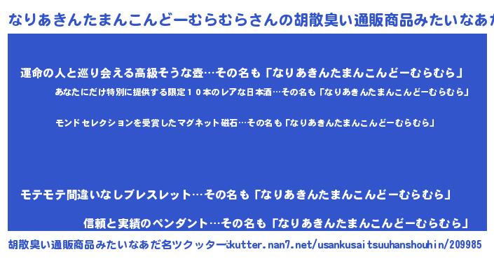 | 男性向けラノベタイトル風あだ名 | 『なりあきんたまんこんどーむらむら~年齢イコール彼女いない歴の魔法使い~』 |