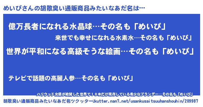 | 意味不明あだ名 | 『めいぴフォーエバー』『ペロリンめいぴ』 |