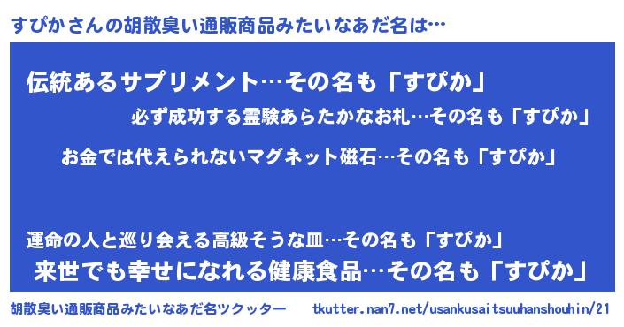 | 男性向けラノベタイトル風あだ名 | 『すぴかに滅ぼされるだけの簡単なお仕事です』 |