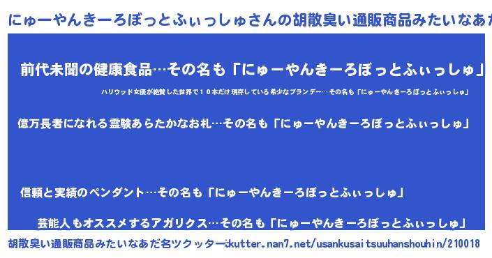 | 欧米人風あだ名 | 『マイケルにゅーやんきーろぼっとふぃっしゅ』 |