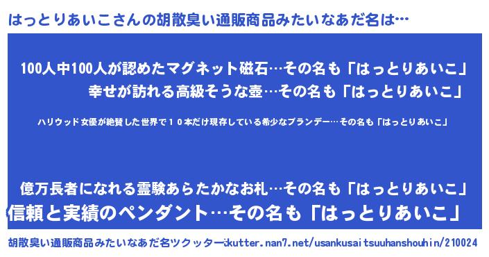 | 意味不明あだ名 | 『住所不定無職はっとりあいこ(81歳)』 |