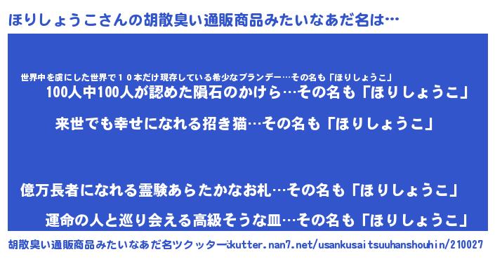 | 男性向けラノベタイトル風あだ名 | 『ほりしょうこという概念が存在しない退屈な世界 』 |
