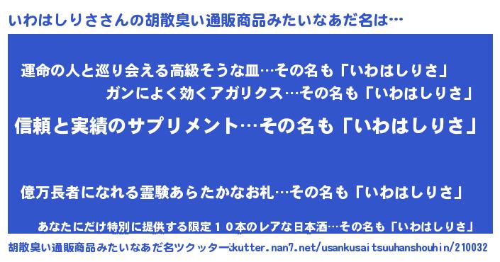 | 男性向けラノベタイトル風あだ名 | 『イワハシリサスレイヤー』 |