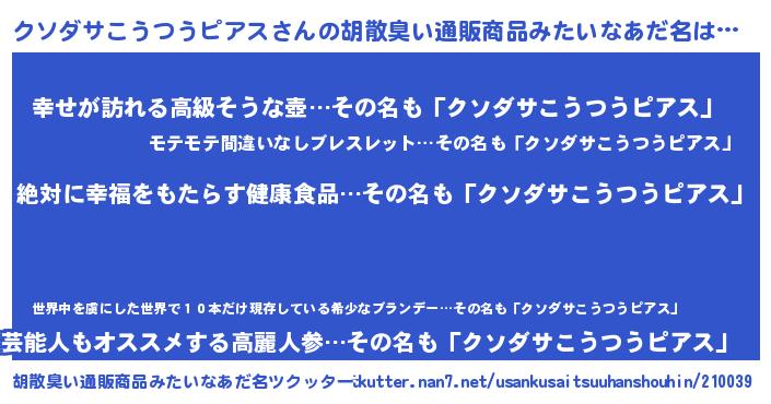 | 男性向けラノベタイトル風あだ名 | 『クソダサこうつうピアスという概念が存在しない退屈な世界 』 |