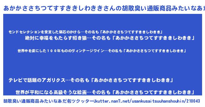 | 男性向けラノベタイトル風あだ名 | 『この素晴らしい世界にあかかささちつてすすききしわききを!』 |