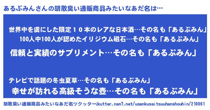 | 女子向けラノベタイトル風あだ名 | 『あるぷみんは平凡を望む』 |