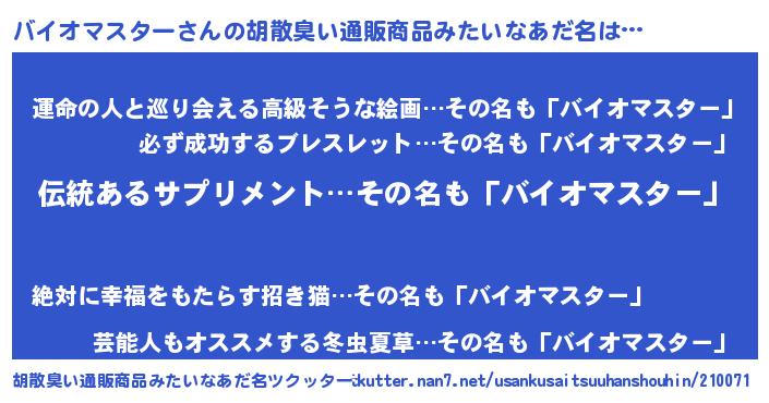 | 欧米人風あだ名 | 『ウサインバイオマスター』 |