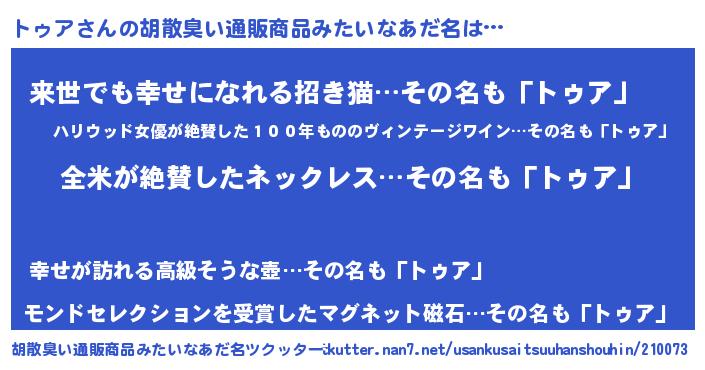 | 男性向けラノベタイトル風あだ名 | 『トゥアの嫁は女の子じゃないと思った?』 |
