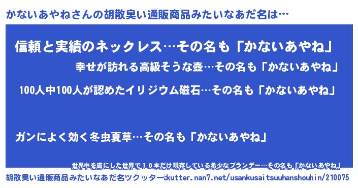 | 女子向けラノベタイトル風あだ名 | 『かないあやね夫妻のなれそめ』 |