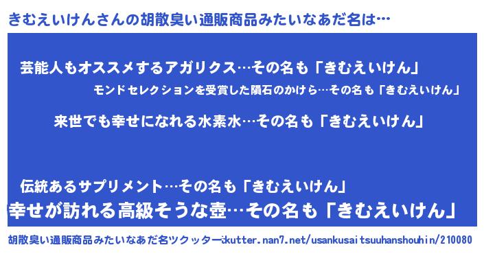 | 男性向けラノベタイトル風あだ名 | 『きむえいけんという概念が存在しない退屈な世界 』 |