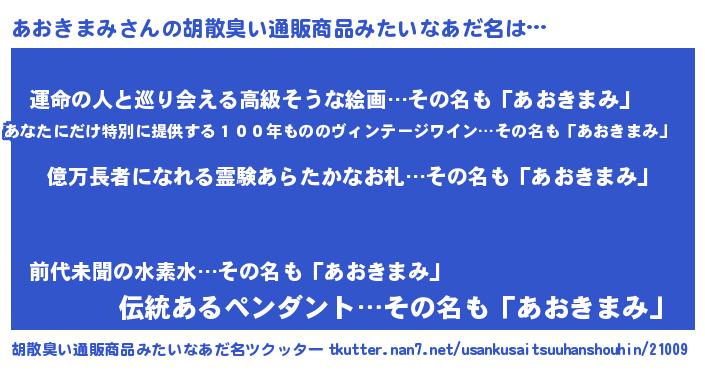 | 男性向けラノベタイトル風あだ名 | 『アオキマミアートオンライン』 |