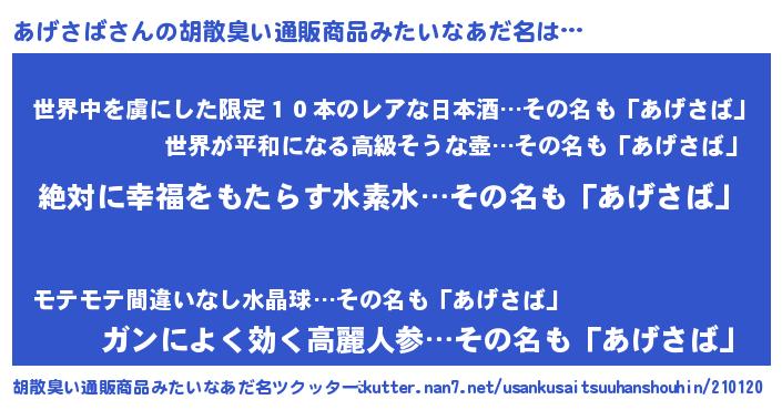 | 意味不明あだ名 | 『永久保存あげさば』『自称あげさば』 |