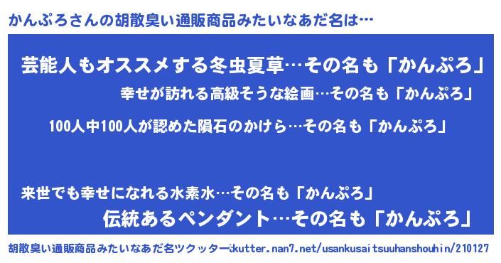 | 男性向けラノベタイトル風あだ名 | 『おまえをオタクにしてやるから、俺をかんぷろにしてくれ! 』 |