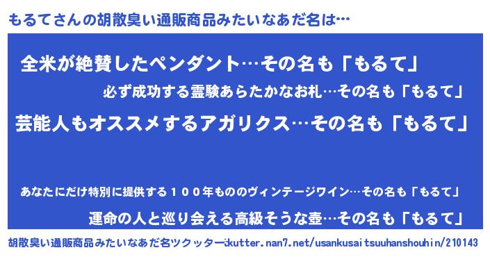 | 男性向けラノベタイトル風あだ名 | 『Re:もるてから始める異世界生活』 |