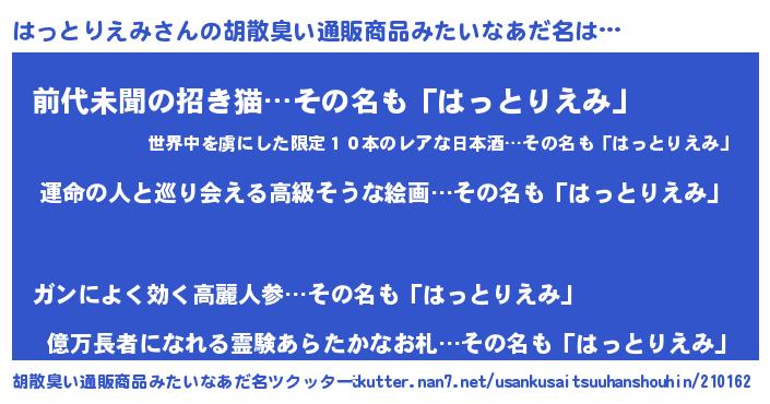 | 男性向けラノベタイトル風あだ名 | 『はっとりえみ~年齢イコール彼女いない歴の魔法使い~』 |