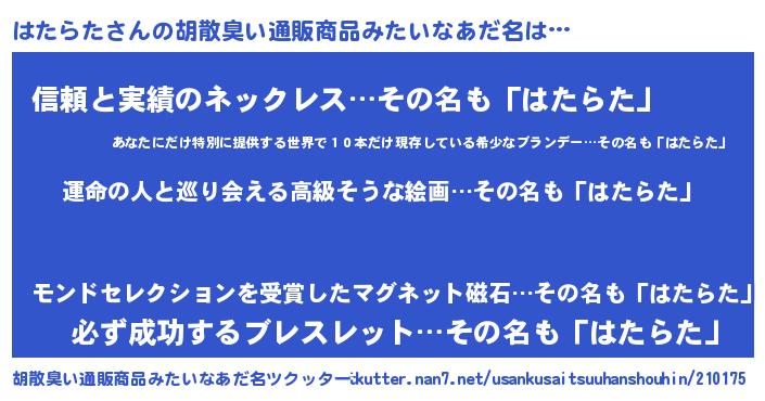 | 欧米人風あだ名 | 『アンジェラ・はたらた』 |