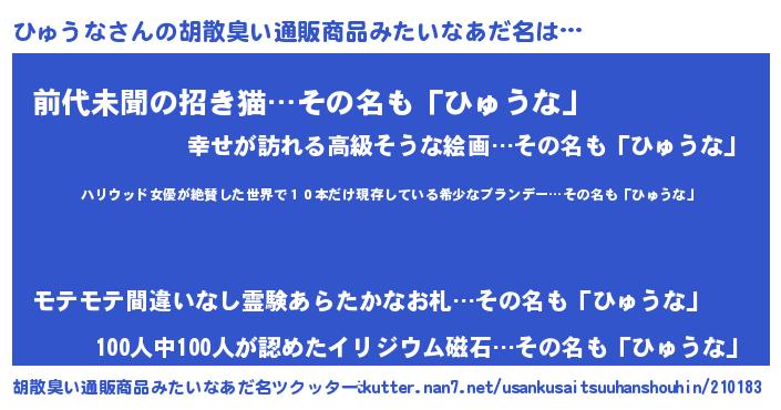 | 意味不明あだ名 | 『住所不定無職ひゅうな(95歳)』 |