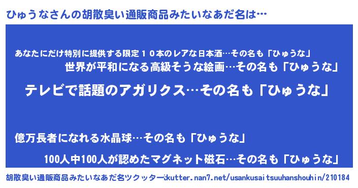 | 男性向けラノベタイトル風あだ名 | 『ひゅうなに滅ぼされるだけの簡単なお仕事です』 |