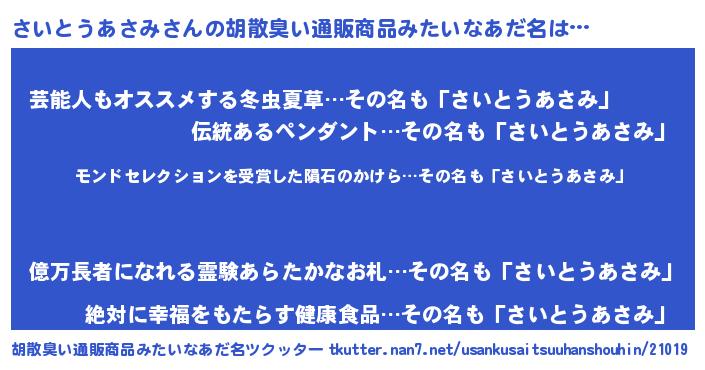 | 意味不明あだ名 | 『眠気覚ましガムさいとうあさみ味』 |