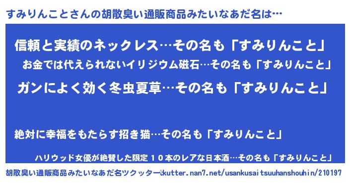 | 男性向けラノベタイトル風あだ名 | 『スミリンコトスレイヤー』 |