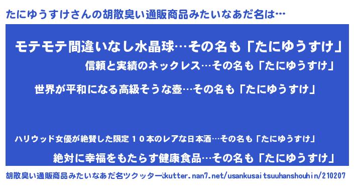 | 男性向けラノベタイトル風あだ名 | 『やはりたにゆうすけの青春ラブコメはまちがっている 』 |