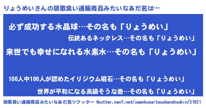 | ヘコむあだ名 | 『りょうめい(苦笑)』『りょにゅー』 |