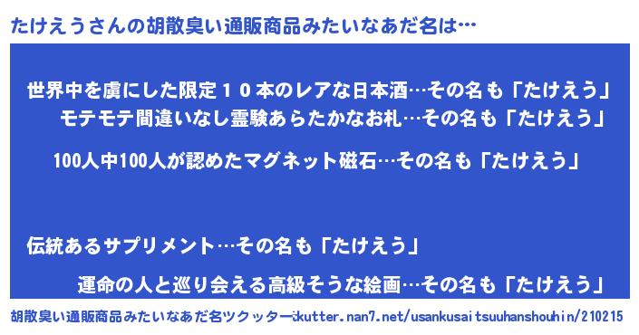 | 男性向けラノベタイトル風あだ名 | 『おまえをオタクにしてやるから、俺をたけえうにしてくれ! 』 |