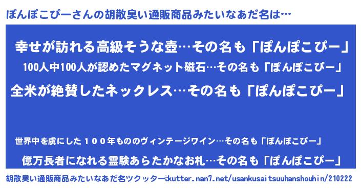 | 男性向けラノベタイトル風あだ名 | 『ぽんぽこぴーの嫁は女の子じゃないと思った?』 |
