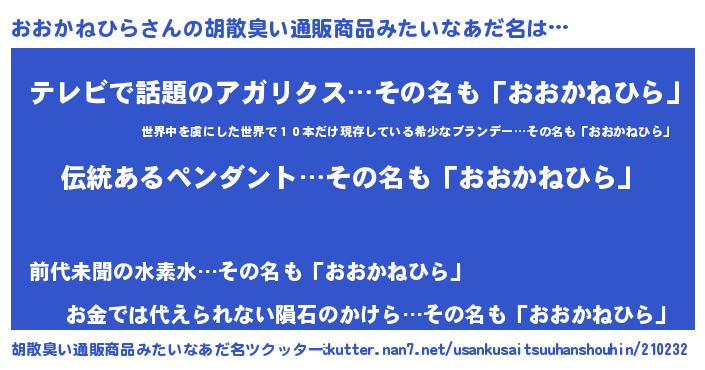 | 意味不明あだ名 | 『とにかく怪しいおおかねひら』 |