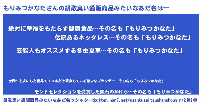 | 男性向けラノベタイトル風あだ名 | 『もりみつかなた~年齢イコール彼女いない歴の魔法使い~』 |