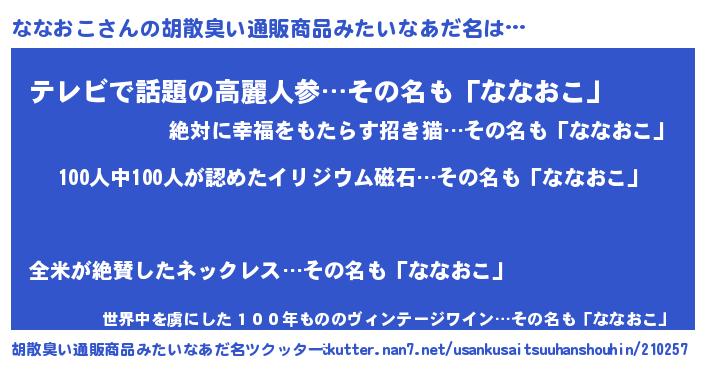 | 男性向けラノベタイトル風あだ名 | 『おまえをオタクにしてやるから、俺をななおこにしてくれ! 』 |