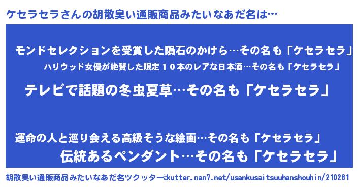 | 意味不明あだ名 | 『自称ケセラセラ』 |