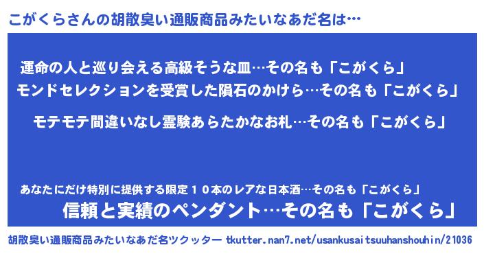 | 男性向けラノベタイトル風あだ名 | 『こがくらの憂鬱』 |