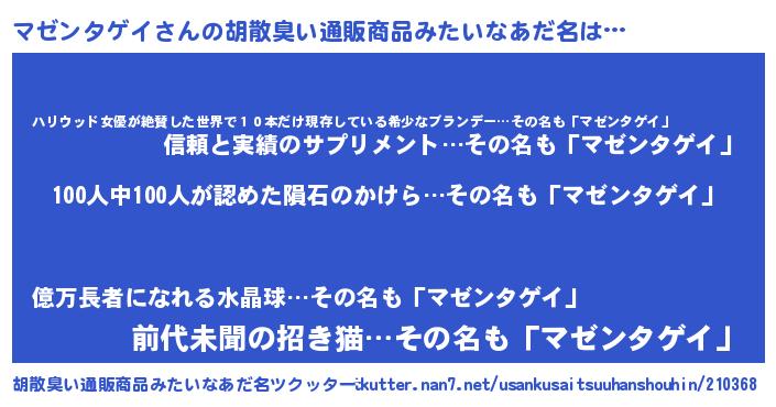 | ヘコむあだ名 | 『マゼンタゲイ(遠い目)』『マゼっちょ』 |