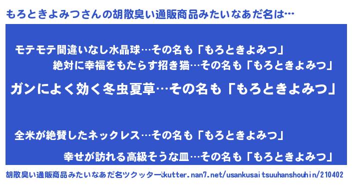 | 意味不明あだ名 | 『自称もろときよみつ』 |