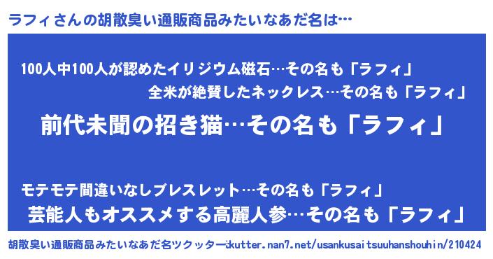 | 意味不明あだ名 | 『永久保存ラフィ』『めかぶ科ラフィ属』 |
