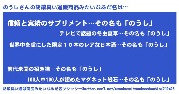 | 意味不明あだ名 | 『住所不定無職のうし(41歳)』『自称のうし』 |
