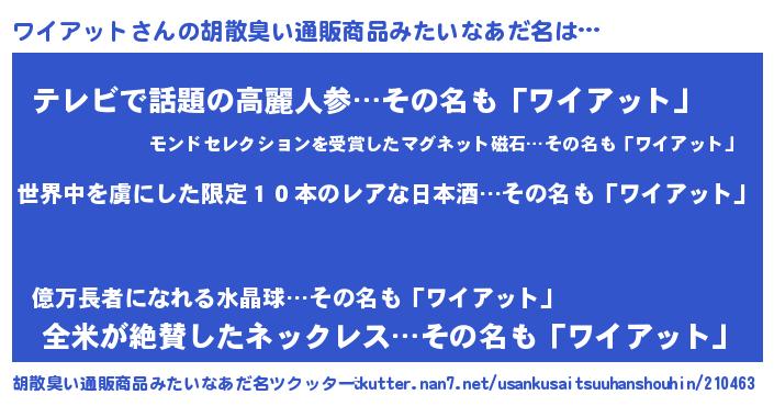 | 意味不明あだ名 | 『住所不定無職ワイアット(65歳)』 |