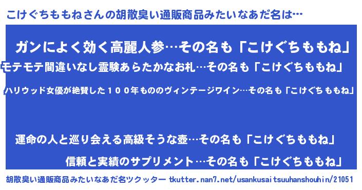 | 意味不明あだ名 | 『住所不定無職こけぐちももね(6歳)』 |
