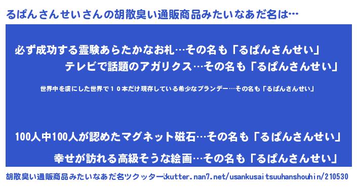 | 意味不明あだ名 | 『住所不定無職るぱんさんせい(84歳)』 |