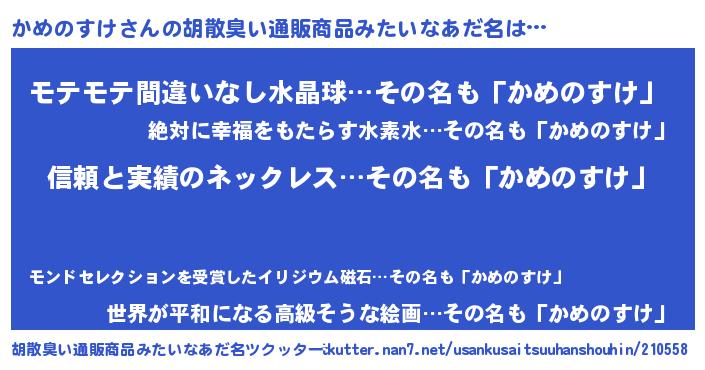 | 男性向けラノベタイトル風あだ名 | 『はたらくかめのすけさま!』 |