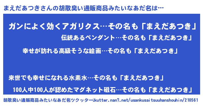 | 肩書あだ名 | 『まえだあつき船長』『まえだあつき少佐』 |