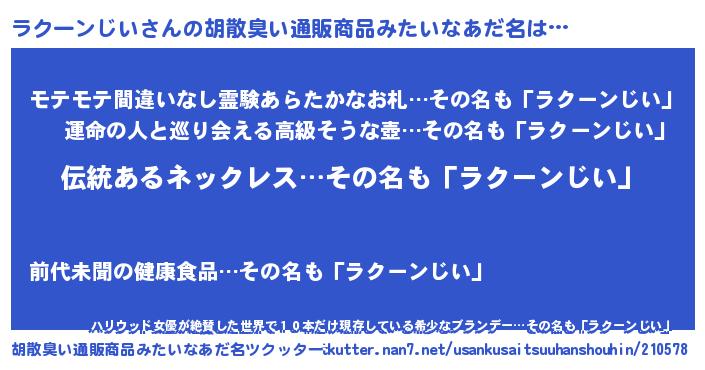 | 欧米人風あだ名 | 『ウサインラクーンじい』 |