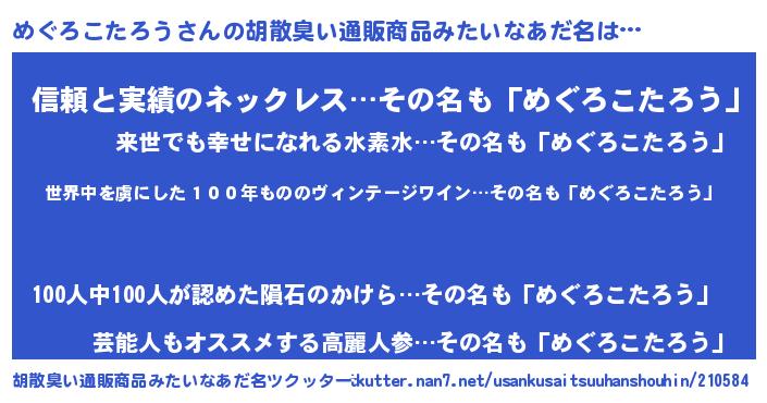 | 男性向けラノベタイトル風あだ名 | 『めぐろこたろうに滅ぼされるだけの簡単なお仕事です』 |