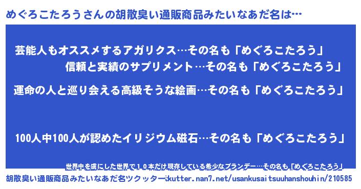 | 男性向けラノベタイトル風あだ名 | 『めぐろこたろう~年齢イコール彼女いない歴の魔法使い~』 |