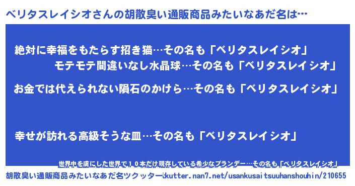 | 男性向けラノベタイトル風あだ名 | 『転生したらベリタスレイシオだった件』 |