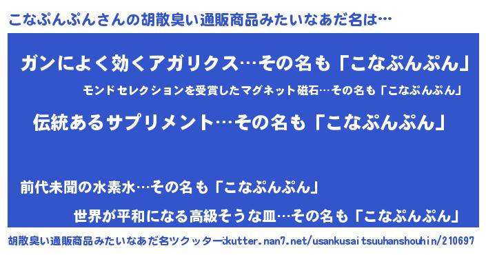 | 男性向けラノベタイトル風あだ名 | 『こなぷんぷんの嫁は女の子じゃないと思った?』 |
