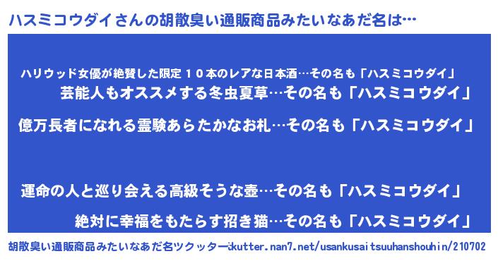 | ヒーロー風カッコイイあだ名 | 『スーパーハスミコウダイ』 |
